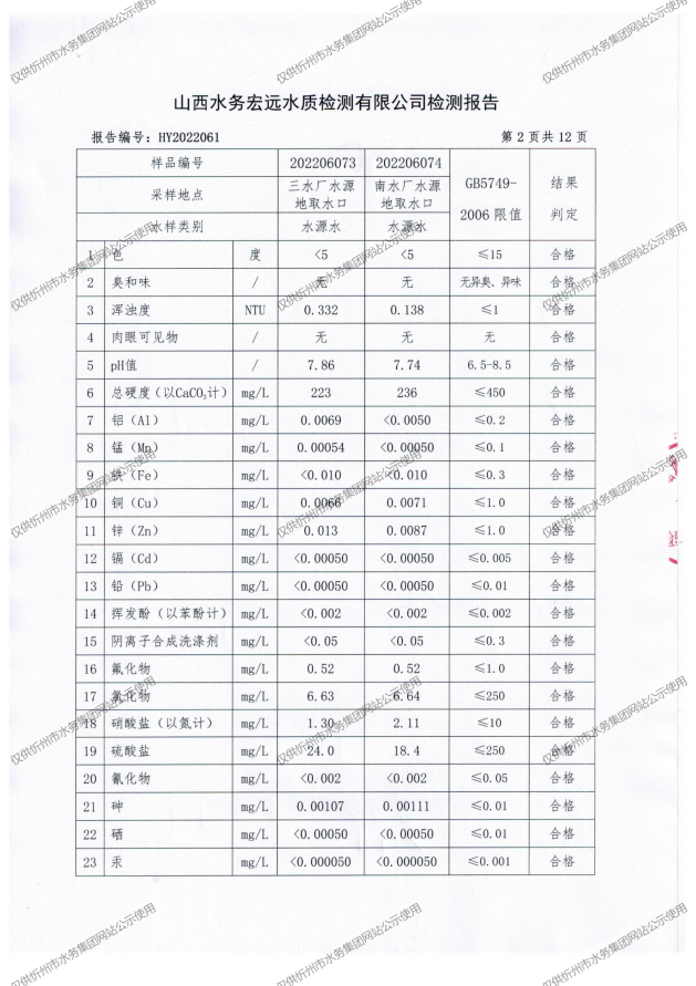 忻州城區(qū)公共供水水源水、出廠水、管網(wǎng)水、管網(wǎng)末梢水2022年6月份水質(zhì)信息公示